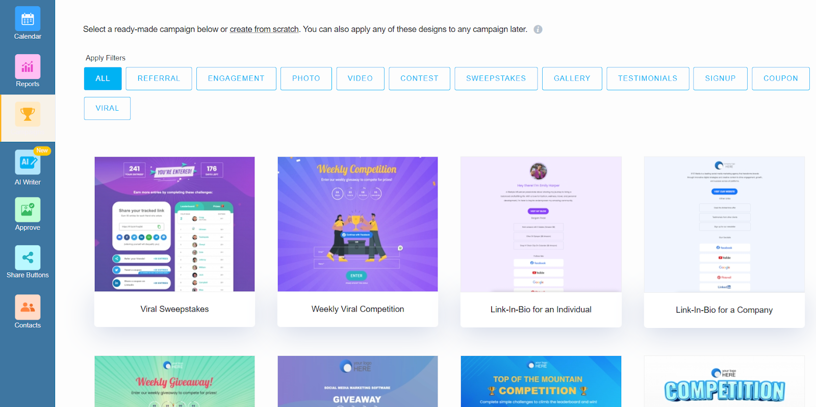 Sociamonials lets you create various campaign types — from referral contests to employee advocacy, testimonial submissions, and deal sharing. If you're running diverse social media initiatives, this flexibility may help.